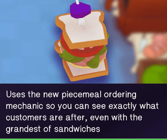 Sandwiches are a new base main dish in this update, with a focus on serving simple ingredients as quickly as you can. Using the new piecemeal ordering system, customers will request each part of their sandwich in turn, keeping things clear and keeping you on your toes.